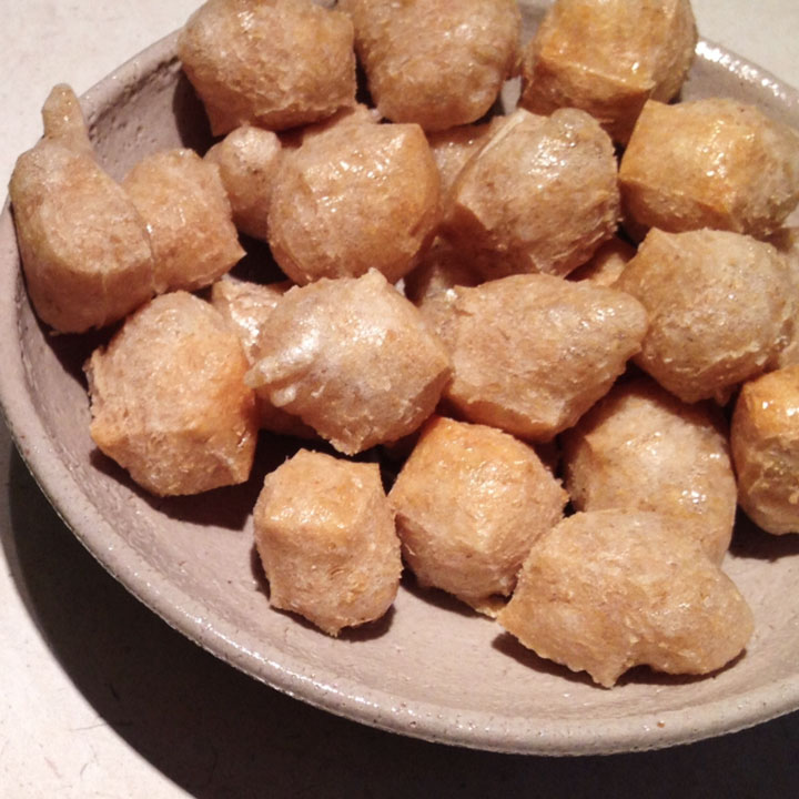No seasonal specialties in Japan are complete without some form of mochi in their delicacy. But we will not discuss these soft, cute little morsels, instead of one type of the most unconventional creation – Brown Rice Kiri Mochi. This defies all laws of your mochi dreams, as it is made of brown rice instead of japonica glutinous rice; it is not sweetened with sugar and is brightened with colours. Our Green cuisine Brown rice Kiri mochi is made from organically grown, freshly pounded cooked brown rice and hardened into squares. We have three flavours: Plain, Cinnamon raisin and Sesame.