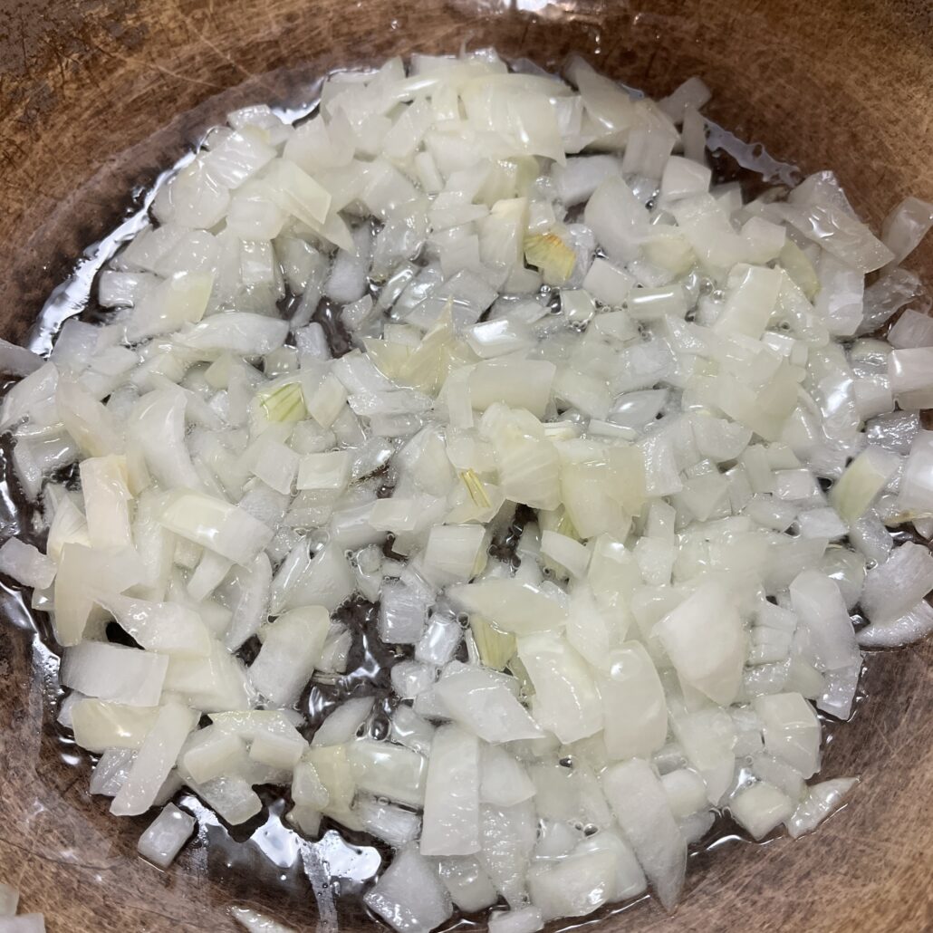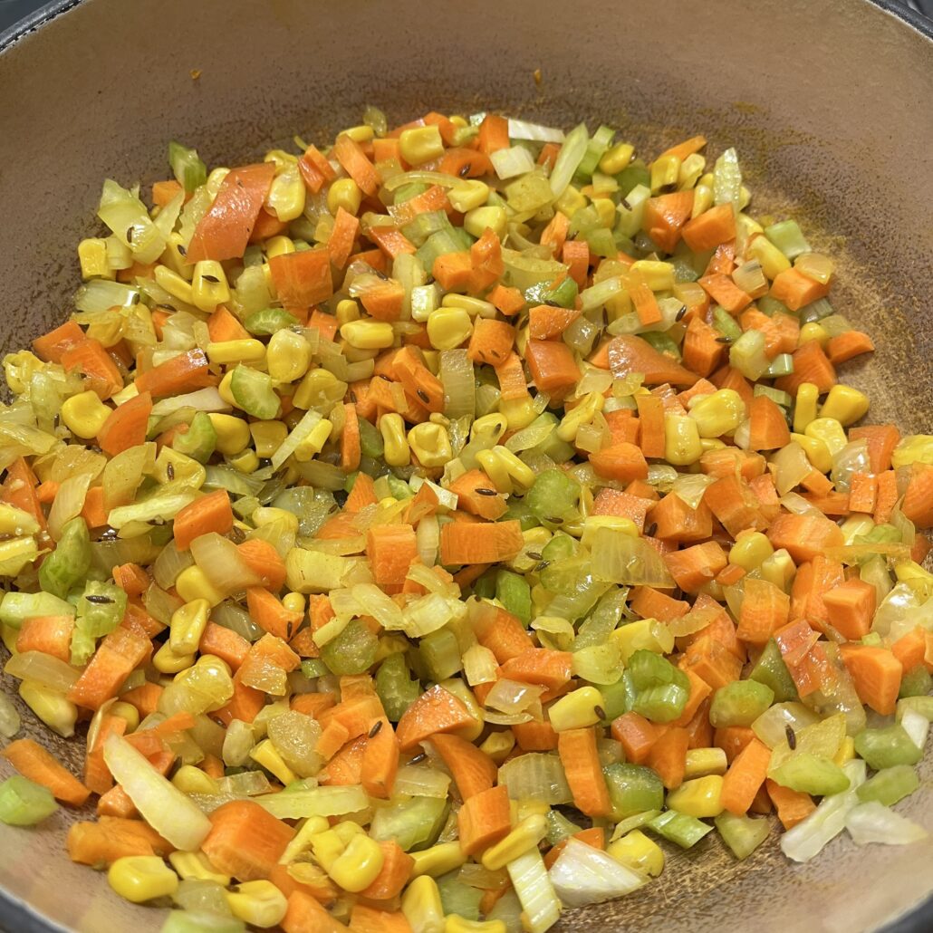 - After a couple of minutes, add the diced veggies to the onions and cook for 5 minutes.