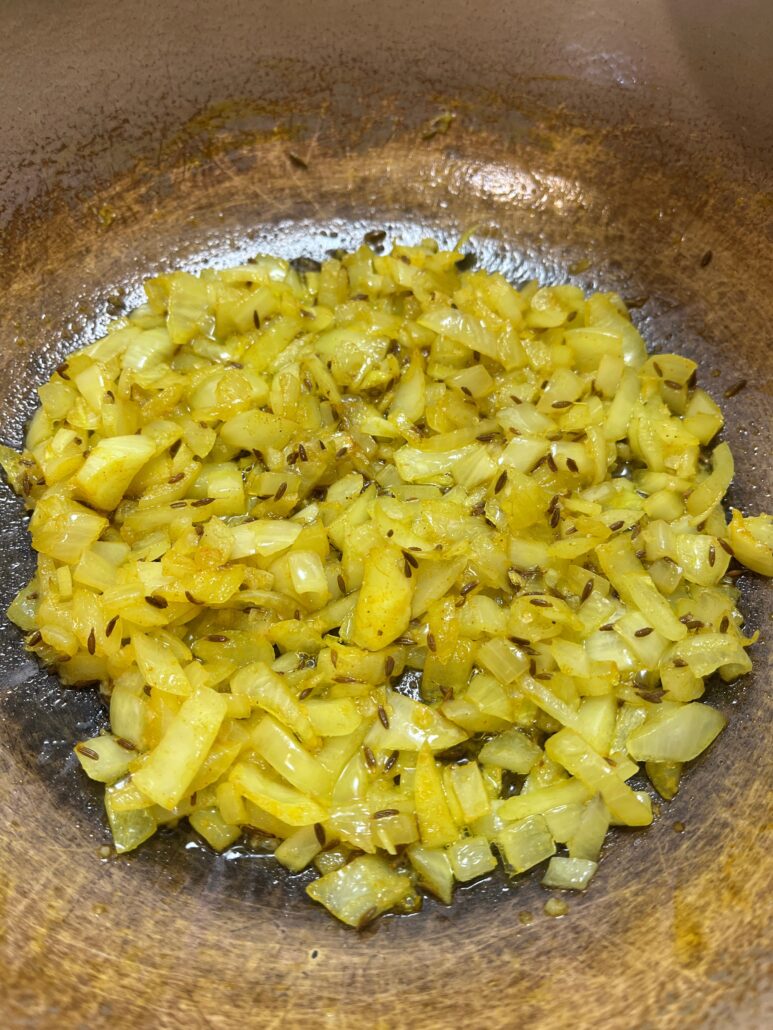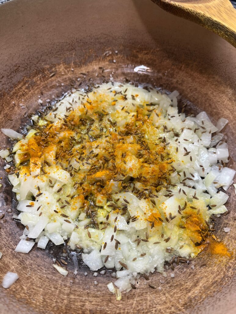 - Sauté the onion until aromatic, add the spices too.