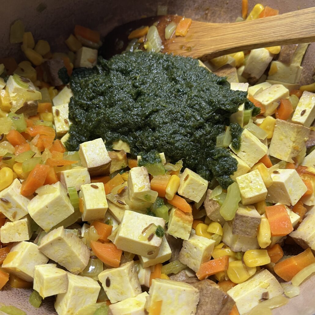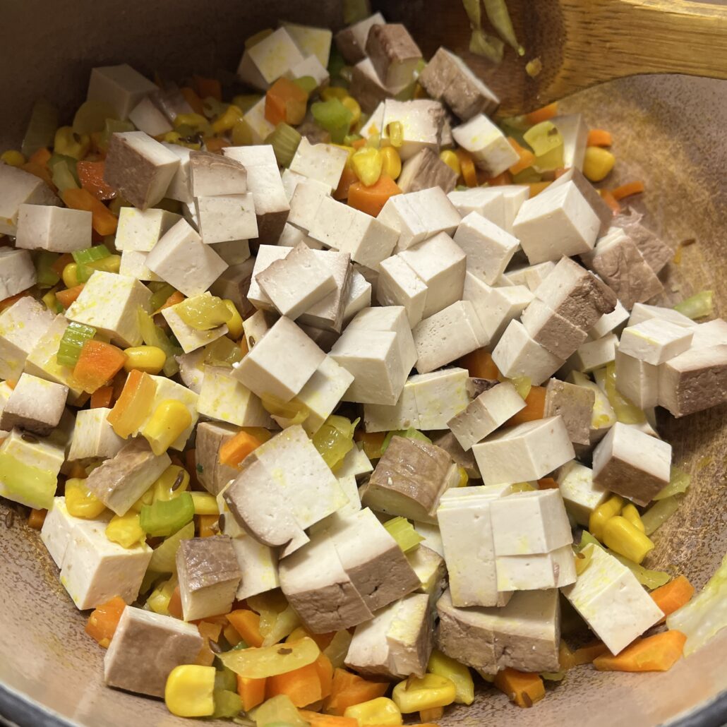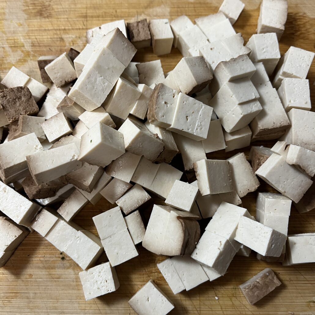 - Dice the tofu into small cubes and add to the pot. Cook it for a couple of minutes.