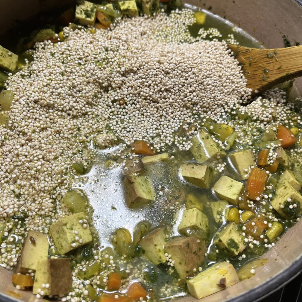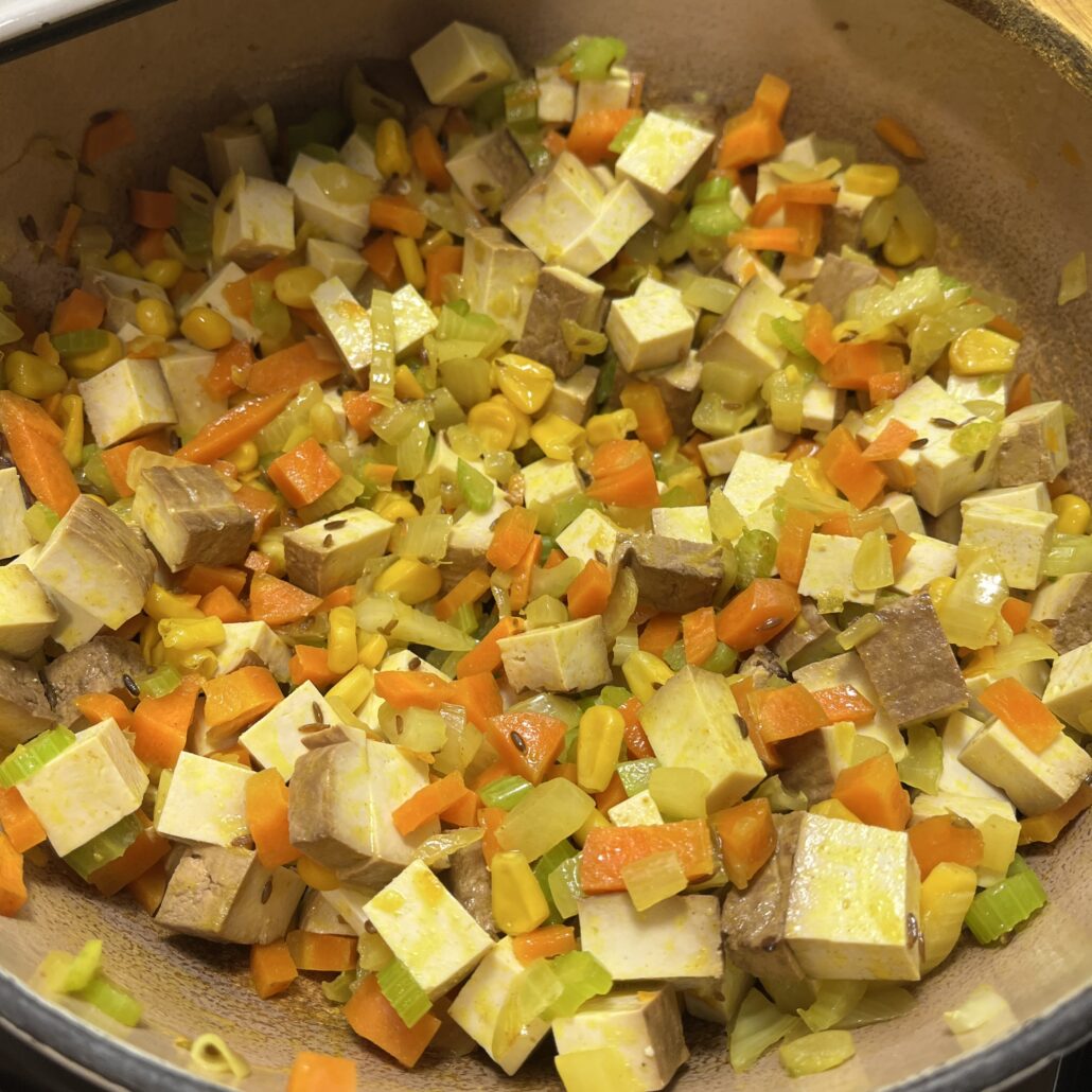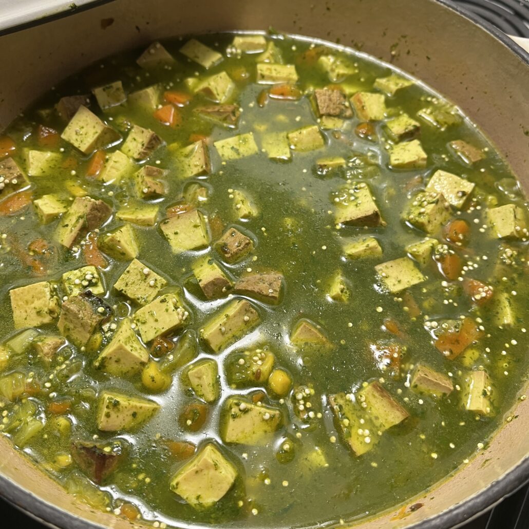 - Dice the tofu into small cubes and add to the pot. Cook it for a couple of minutes.