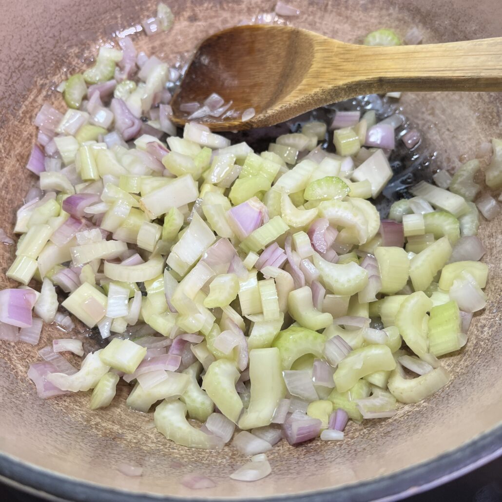 - In a heavy-bottomed pan, heat the sesame oil over medium heat and sauté the shallots and celery until translucent and aromatic.