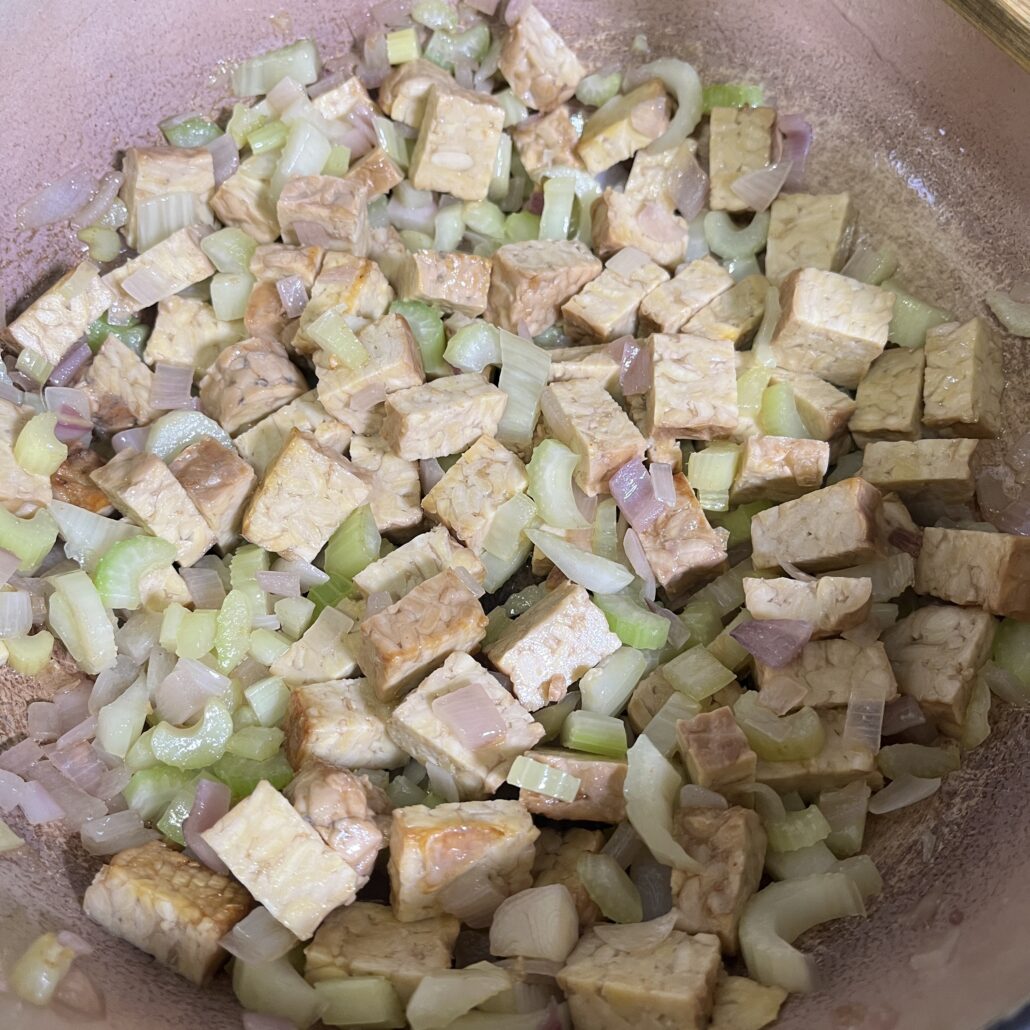 - Add the tempeh cubes and cook until golden and slightly crispy on all sides.