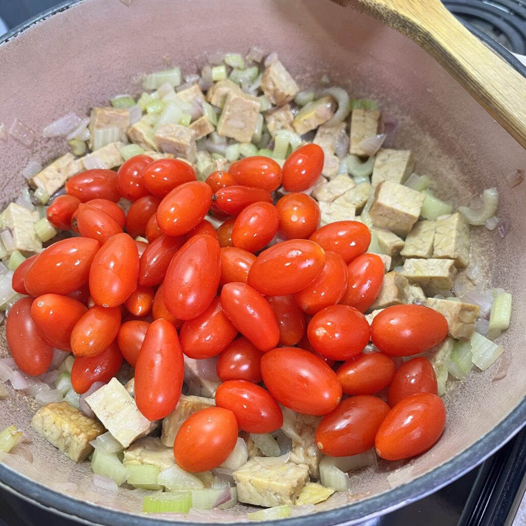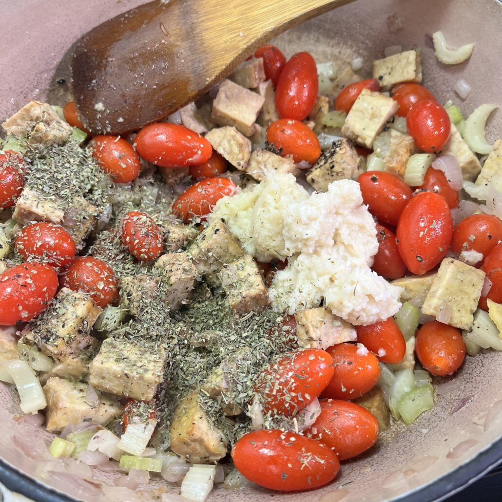 - Add the cherry tomatoes, salt, dried herbs, and black pepper. Stir to combine.