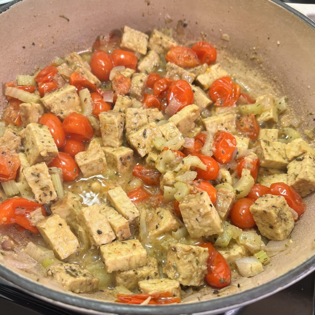 The star ingredient here is Green Cuisine’s Smoked Tempeh, a protein-packed marvel that transforms ordinary dishes into something extraordinary. Unlike tofu or other meat alternatives, tempeh brings a firm, meaty bite and an earthy complexity that’s been enhanced with a delicate smoking process. When pan-fried until crispy, it becomes irresistibly golden on the outside while staying tender within—making it the perfect companion to our Mediterranean-inspired medley of olives, tomatoes, and fresh herbs.