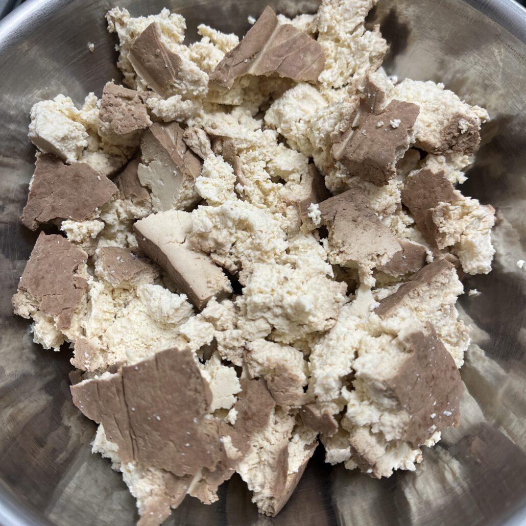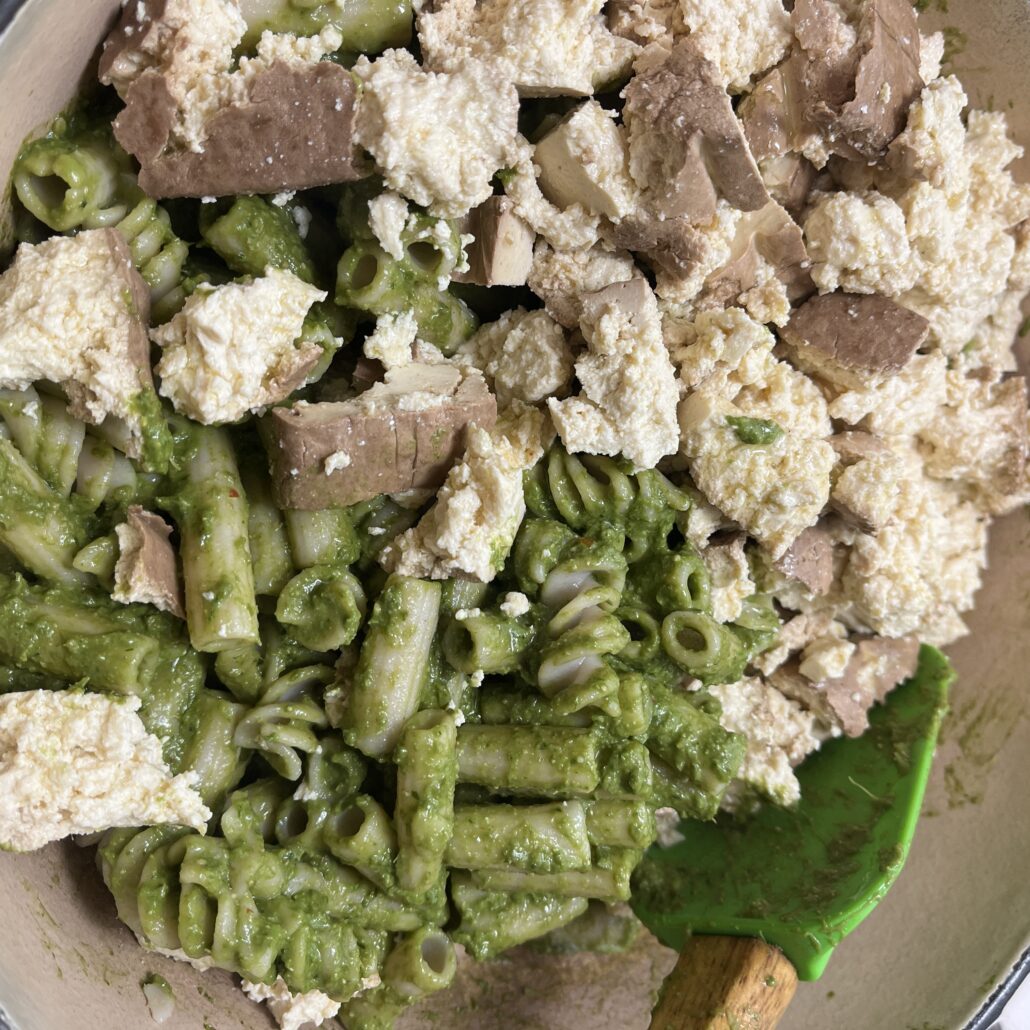 - Add the tofu chunks and combine the pasta. Keep aside while prepping the vegetables.