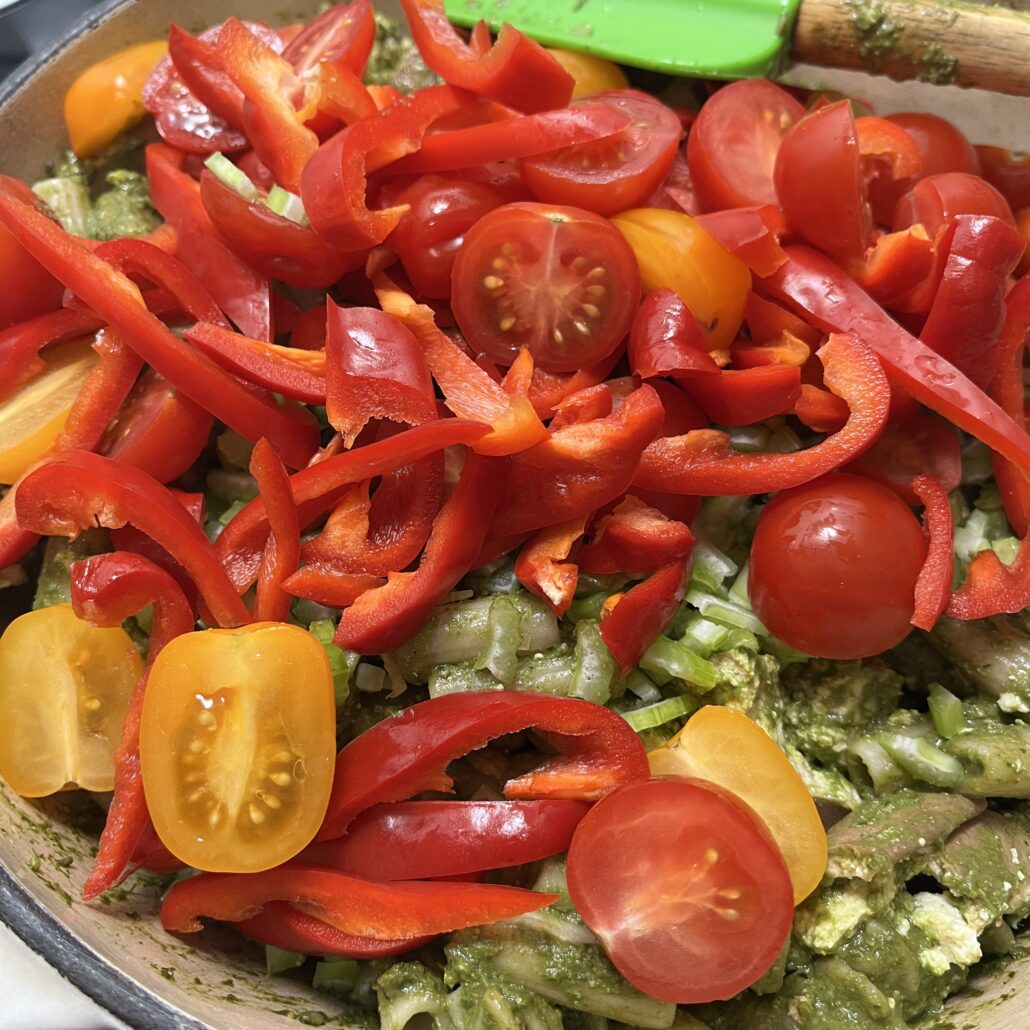 1/2 Cup Pesto Dressing (find recipe here: https://www.greencuisine.com/pesto-crostini-with-tofeta-and-roasted-tomatoes/)